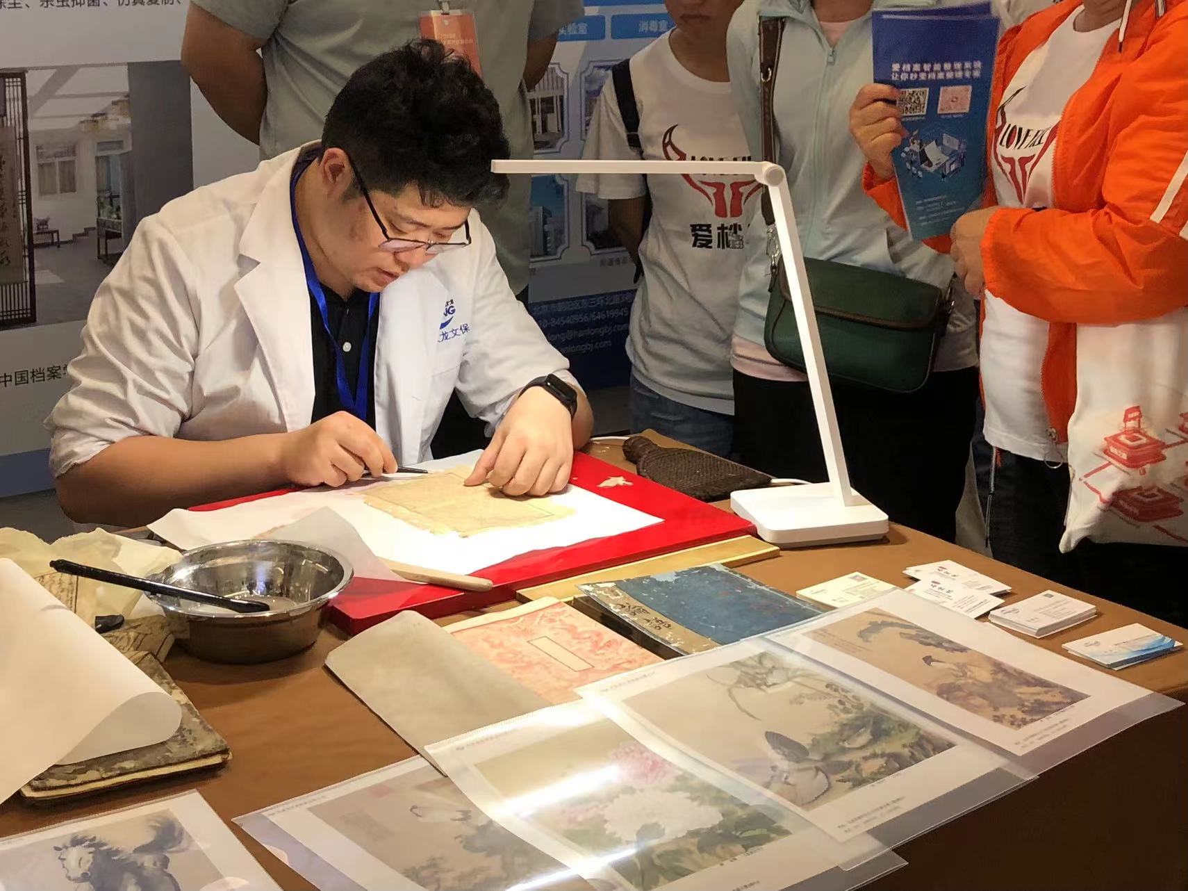 北京市漢龍實業(yè)有限公司還現(xiàn)場進行了文獻修復演示,并展示了破損檔案、古籍、字畫修復前后對比圖,公司制作的文獻仿真復制件,以及采用仿真復制技術(shù)制作的文創(chuàng)產(chǎn)品,大批觀眾對公司的文獻修復、仿真復制工藝贊嘆不已。